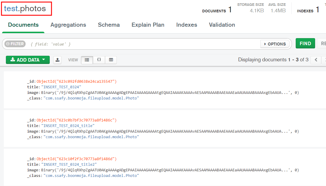 test라는 데이터베이스에 photos라는 컬렉션(테이블)이 있고 다큐멘트(스키마)들이 있다.